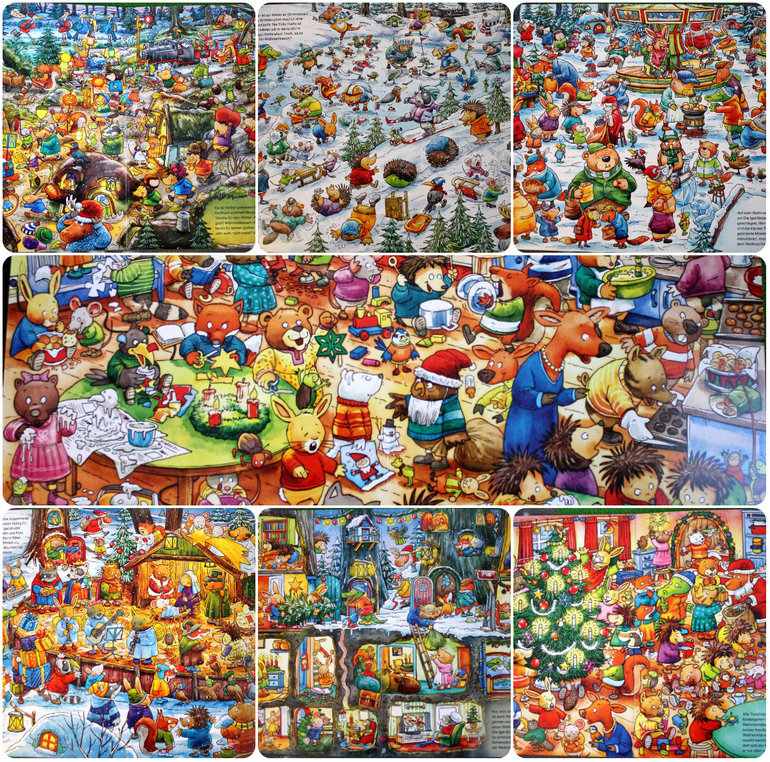 2. Weihnachten im Wimmelwald. Как вы думаете ведь в сказочном мире не только люди но и животные готовятся к такому замечательному празднику как Новый год и Рождество. В этой книге очень наглядно изображены последние подготовки ежиков, кроликов, белок и других милых обитателей леса к этим замечательным праздникам.