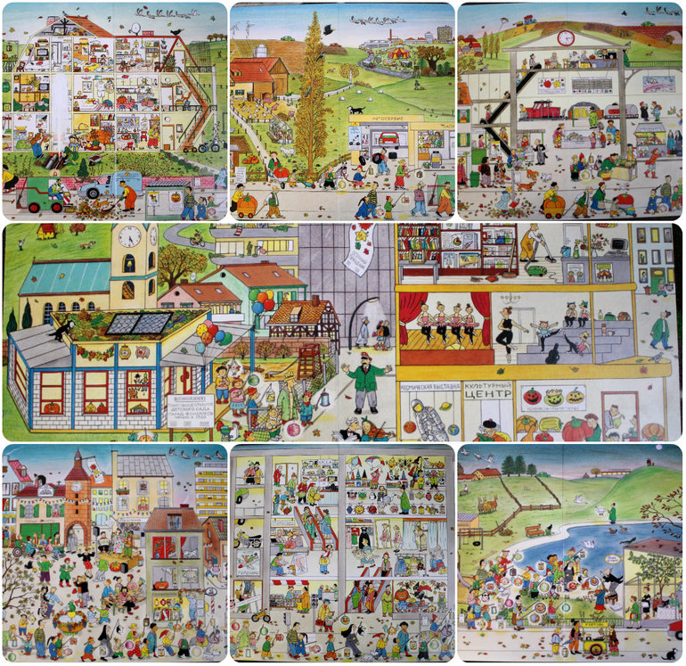 Разумеется у нас тоже есть книга картинка всем известной Сузанне Бернер Городок, мы взяли на пробу пока Осеннюю книгу, так как сейчас наступила Осень, прекрасная пора, все кругом покрыто лиственным золотом и роскошью. Долго я размышляла по поводу ее приобретения, потому как отзывы ходят различные тут на ББ, кого то не устраивает плоскость рисунков, кто то не видит смысла в ней, но видя большой интерес своего сына к предыдущим книгам картинкам, я все же чуток поджала свой кошелек и решила взять одну, так как цена у нее далеко не маленькая. И о чудо! Теперь эта наша самая любимая книга, рассматривать ее можем часами, раньше такая история была лишь со знаменитой "Очень голодной гусеницей". И с каждым разом мы находим в ней что то новое, необычные ситуации происходят у персонажей, празднуют праздники которых нет у нас,очень увлекательно и познавательно а главное ребенку нравится))))Меня же она привлекла большим "кипишем" в книге, более разнообразные ситуации и большой палет для фантазии и размышления. Теперь я уверена буду покупать остальные книги из этой серии.