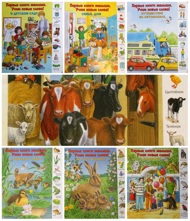 Первыми книгами из серии книг- картинок у нас появился бюджетный вариант совсем скромного издательства "Улыбка", но ничуть не менее познавательного. И о чудо Миша воспринял эти книги на ура!, и дня не проходит чтобы мы не посидели не разглядывали их. Да книги не ламинированные, размер их чуть больше тетрадного листа, имеют по 5 разворотов и ни один сантиметр книги не упущен, все везде прорисовано. Конечно картинки не такие яркие и сочные как у немецких книг, но я их очень рекомендую всем, особенно тем, кто не пробовал этот жанр, и не знают заинтересуется ли ими ребенок, а стоят они копейки и для первых книг они ох как хороши. Я скупила почти всю серию, кроме "Первые книги малыша. Учим новые слова. В лесу.", но обязательно куплю. И вот оно наше богатство)))