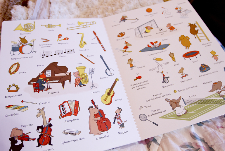 Картинки в книге все подписаны. Они не очень крупные, но расположены на страницах приятно глазу. Причем, это не просто предметы или существа - многие сопровождаются действиями очень милых зверушек.