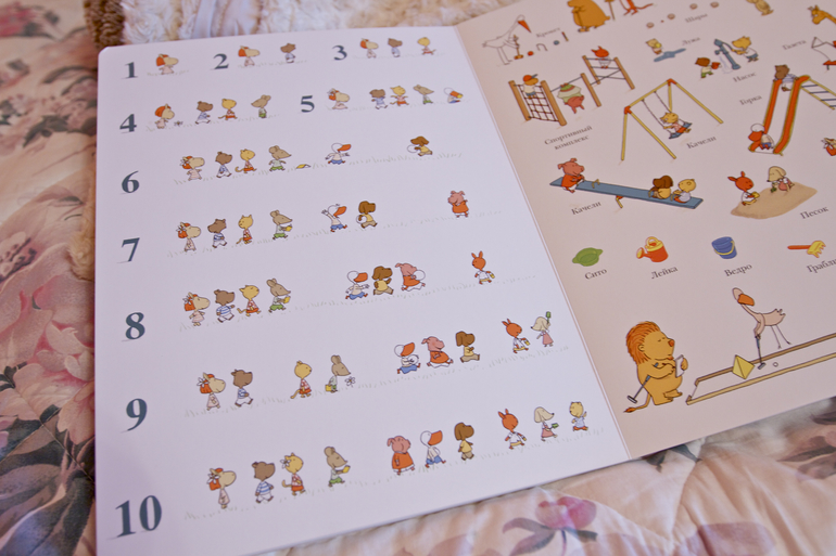 На каждом развороте свои темы. Все, что изображено встречается малышам в повседневной жизни. Есть и разворот с животными, причем они изображены в масштабе. Вообще очень милое сочетание мультяшных зверьков и вполне повседневных предметов.