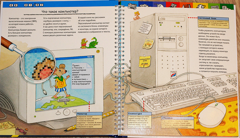 Сразу скажу, книга ОЧЕНЬ понравилась и сыну и папе и мне. Информация подана понятно, ничего лишнего, без особых подробностей. Чтобы книга понравилась мужу это редко, обычно на новую стопочку у него реакция, знакомая многим "ШО?! Опять?!" (с). Поэтому новые книги часто попадают к нам домой тайными тропами и быстро стараются слиться с местными, делая вид что они здесь испокон века. Энциклопедии и научно популярные книги входят гордо :). Итак из чего состоит компьютер и как эти элементы называются: