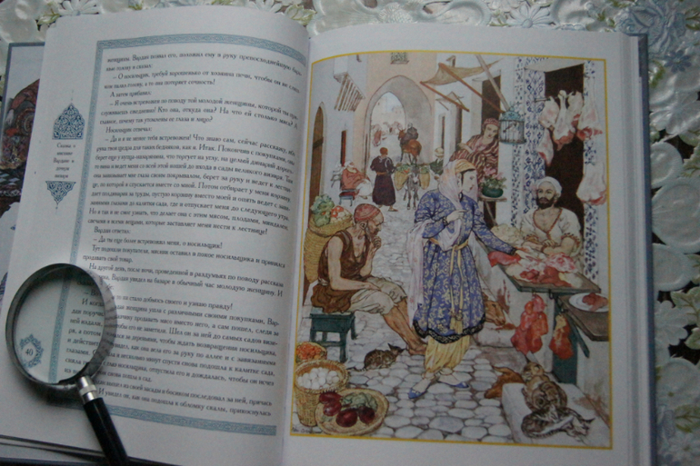 В целом читается легко, сюжет затягивает, а восточный колорит отражен очень ярко. Всего включено семь сказок - есть короткие (упомянутые мной про Шахеризаду и про Мясника), есть длинные - где бедный герой не успевает избавиться от одной напасти, как вляпывается в следующую и так достаточно долго.