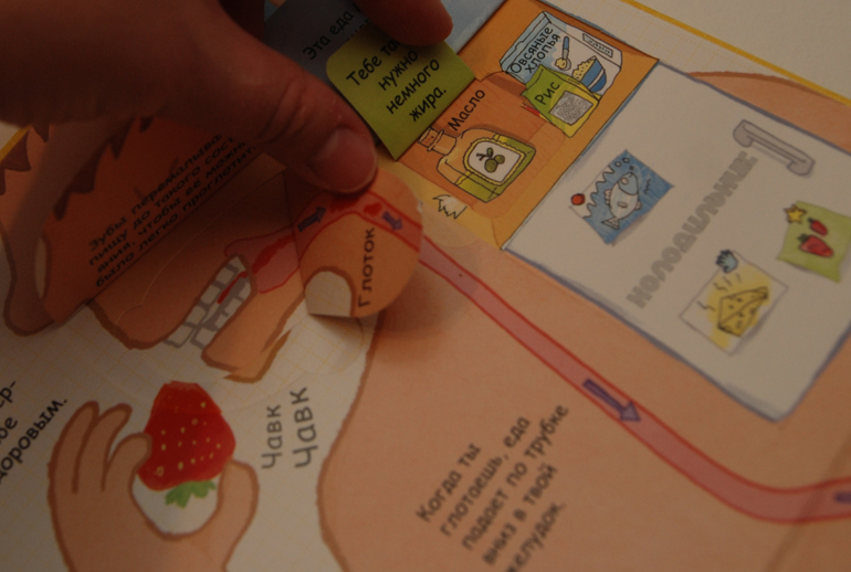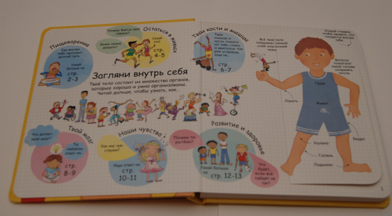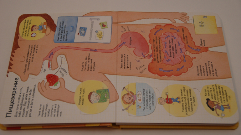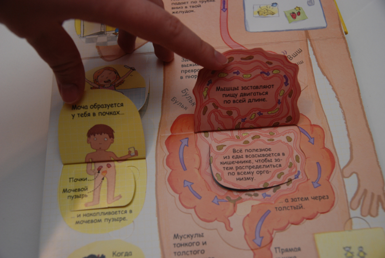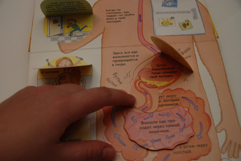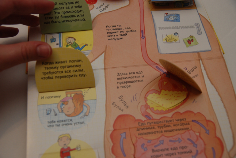 Возраст заявлен 6+. Мне кажется вполне и раньше можно, если есть интерес у ребенка. Информации и текста в книге достаточно много, но преподнесена она очень просто, с интересными фактами и чудо-окошками! В 3 года можно вполне приступить, что-то будет сложновато, оставить на потом (лучше все-таки ближе к 4-ем годам). Я как-то обронила, что еда попадает Мише в ротик, спускается по пищеводу в животик и потом выходит из попки. Ему запало, ходил пересказывал, показывал, потом вроде забыл. А сегодня спросил: "мама, а что у меня в животике?", вот и решила достать, самой же тоже интересно!