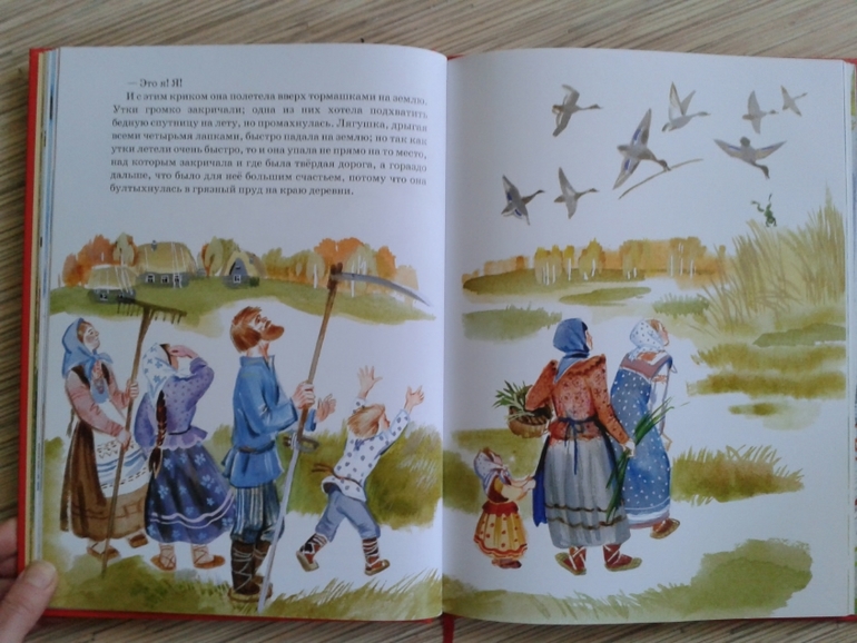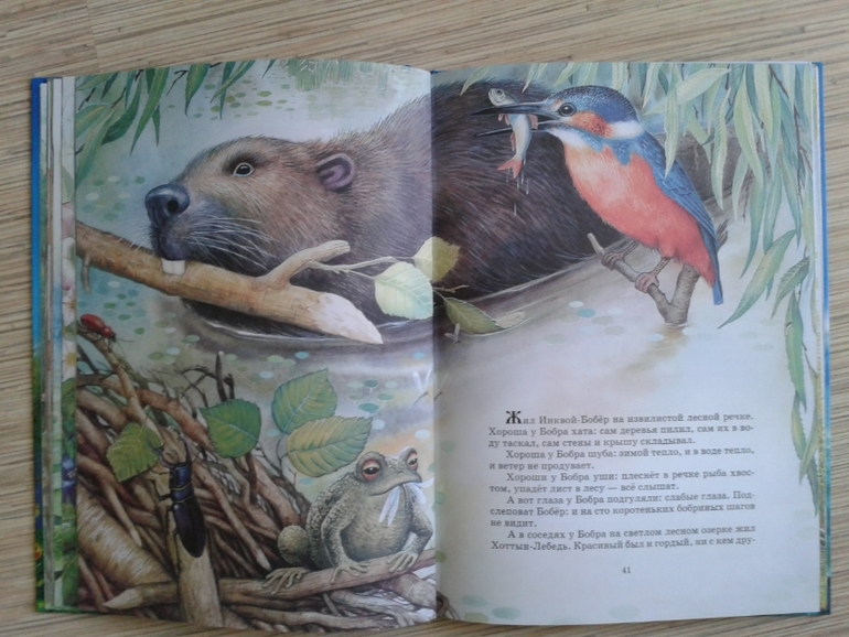 Кроме основной сюжетной линии тут есть на что полюбоваться на каждом развороте. Вот внизу лягушечка поймала комара и задумчиво держит его во рту. Птичка ловко выловила рыбку из пруда....