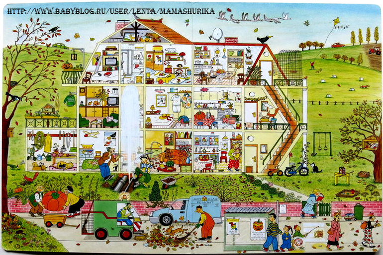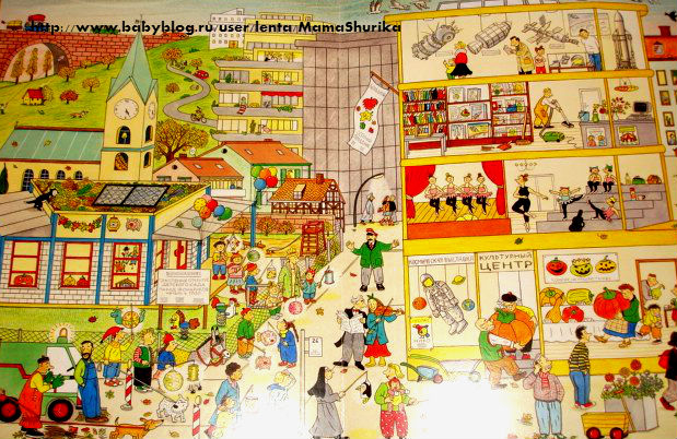 Всем известная книга из серии "Городок". В этих книгах нет слов, ребёнок учится составлять рассказ по картинке, при этом отличительная особенность серии этих книг, это единый сюжет, жизнь городка в разное время года, на каждой страничке мы видим что делают наши герои, куда они пошли, чем заняты, можно попросить ребёнка придумать имена для героев, рассказать что они делают, придумать свою историю. В общем книга очень полезная и нужная и для развития детской фантазии и для развития речи, умения составлять предложения и диалоги. Страницы из картона, книга очень большого формата.
