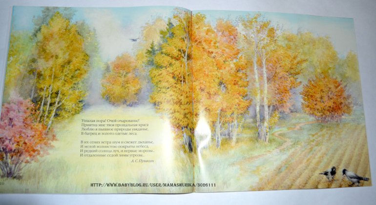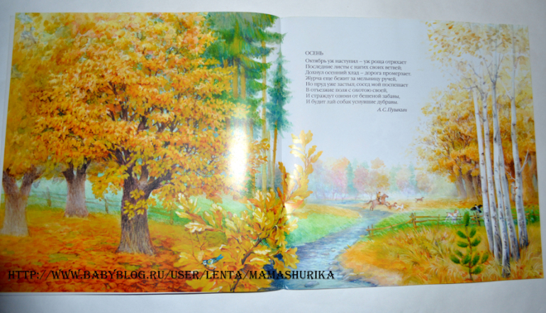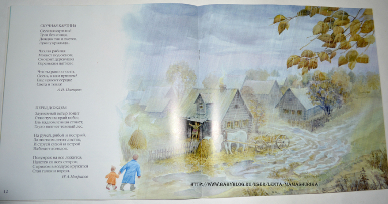 Отличная книжечка, очень большой квадратный формат ( с собой взять неудобно, зато дома расположившись на уютном диване просто идеально:). В книге очень приятные, тёплые иллюстрации ну и замечательные стихи известных русских поэтов Пушкина, Тютчева, Бунина, Некрасова и других.![]()