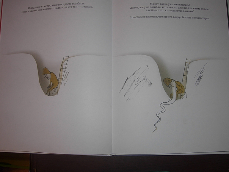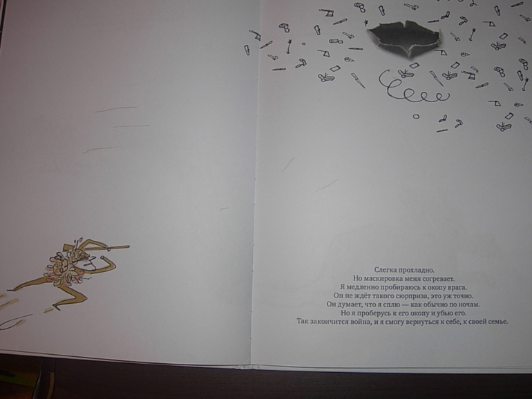 К чему могла прийти мама в итоге разговора с сыном? Что война — это плохо. Это смерть ( после недавней смерти его дедушки , много задавал вопросов на эту тему, мне очень помогла книга "А дедушка в костюме?" ). Что простые люди страдают. А для других война — это обогащение. Но сын у меня абсолютно не "воинствующий" мальчик . Игру в "войнушку" не любит. Поэтому для меня был удивителен его выбор именно этой книги.