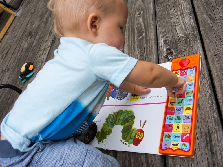 Затем приехала одна из немногих говорящих книг в нашем доме. Ваня может заниматься с ней самостоятельно, минут по 30 увлеченно тыкая в кнопочки.