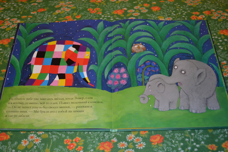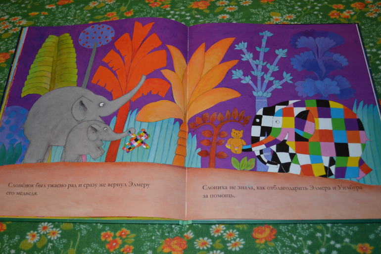 Это не первая книга в серии, но вполне можно читать и не по порядку, как я поняла.Книга малышковая.Мой сын (и я этому не удивлена) её сразу оценил!А как же?Ведь в ней затронута любимая тема всех малышей: кто-то теряется, кто-то ищет и потом тот, кто потерялся, обязательно находится!))) Так и тут: потерялся плюшевый медвежонок у слонёнка, и Элмер дал ему на время своего медвежонка в клеточку, а сам пошёл искать медвежонка слонёнка.Всех зверей обошёл, у всех такие же медвежата (но это, как оказалось, на первый взгляд!), а медвежонка слонёнка нигде не было.Но наконец и он нашёлся благодаря кузену Элмера Уилбуру (прямо язык заплетался, когда читала их имена!), и этот момент конечно самый любимый у Димы))) Ну, а в конце мораль, что не все медвежата одинаковые.Может они и похожи на первый взгляд, но каждый особенный.Вот.В целом книга понравилась.Но лично меня не зацепила настолько, чтобы отдать за неё 400 (!) рублей!Сын вчера пришёл из сада и сразу потянулся за ней) Это радует.Почитаем 2 недели и вернём.Покупать конечно не буду.На мой взгляд "красная цена" книге 200 рублей.Ну, и развороты: