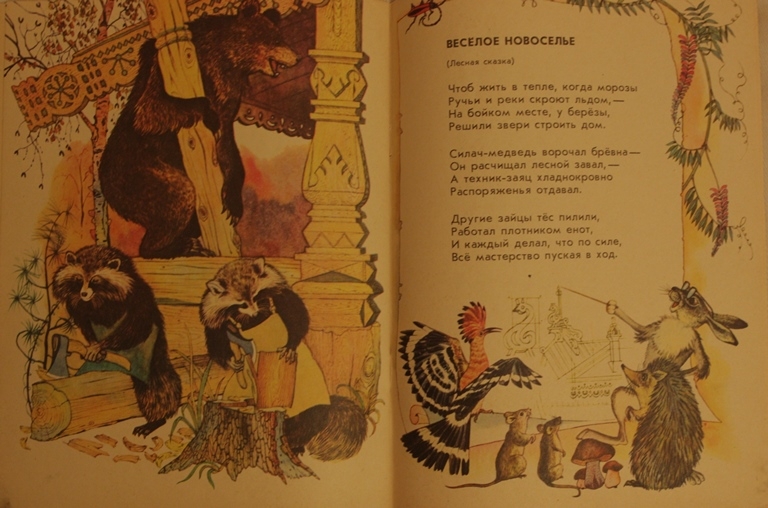 Геннадий Павлишин родился в Хабаровске и книга "Веселое новоселье" Петра Комарова была издана в Хабаровском книжном издательстве. В иллюстрациях начинает просматриваться узнаваемый стиль Г.Павлшина - стиль "предельной реалистичности, тщательности всего изображаемого (и деревьев, и людей, и животных)". Не могу оторвать глаз от коры деревьев и шерсти животных, так тщательно они прорисованы. Рада, что стали переиздавать книги с иллюстрациями Г.Павлишина, такие как "Амурские сказки" и "Таежные сказки", возможно и эту книгу переиздадут (это просто клад на тему природы). Очень хочу вас с ней познакомить. Обложка утеряна, она была синей, но что на ней было нарисовано, уже не помню.