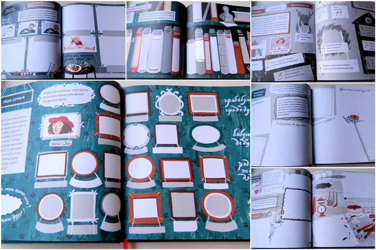 Каждая страница книги интересна по-своему. Можно нарисовать себя и родственников или вклеить фото, взять интервью, приготовить со взрослыми любимые семейные рецепты, узнать о семейных талантах, смешных и грустных историях, разгадать семейный кроссворд и даже поиграть в настольную игру. И ещё много-много всего интересного, что лично мне и не пришло бы в голову рассказать своим детям.
