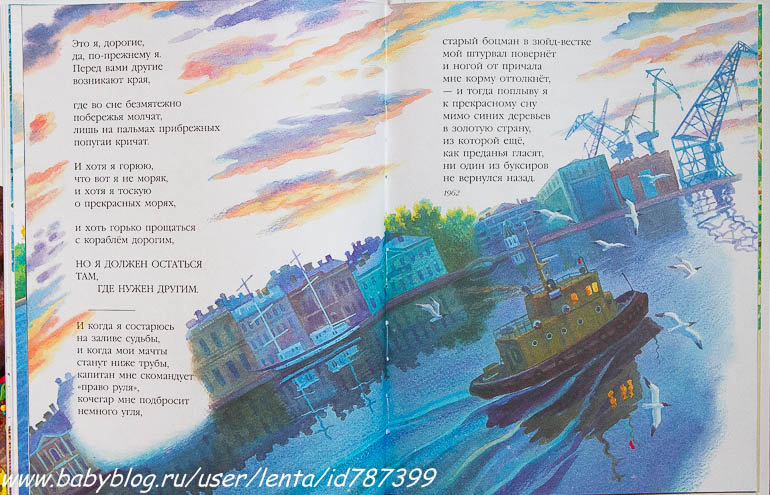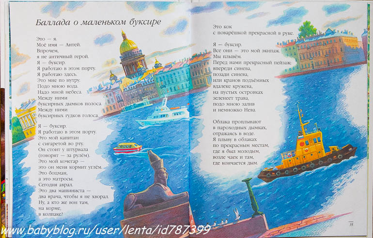 Книга предназначена для среднего школьного возраста, видимо, потому что Бродский, но многие стихи интересны и младшим дошкольникам: "Чистое утро", "Рабочая азбука", "Пират", "Ссора", "Летняя музыка " (ОСОБЕННО!), "Баллада о маленьком буксире". Хороший такой получился сборник.