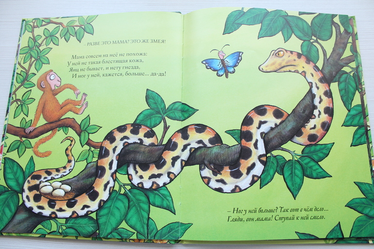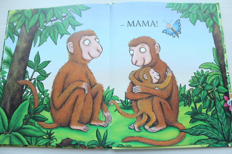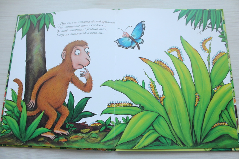 Книга формата А4 с мелованными страницами и очень сочными иллюстрациями. История, про то, как мотылек помогал обезьянке найти маму. Но, так как у мотыльков непохожие дети, то поиски мамы затянулись)))