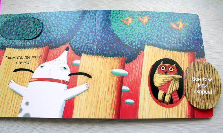 Но внутри все та же милая собачка, которая хочет узнать, где же живет маленькая птичка?