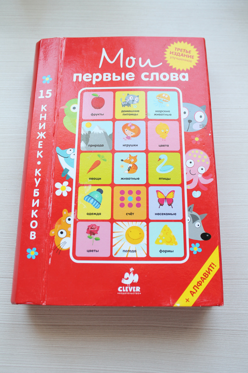 9. "Мои первые слова. 15 книжек-кубиков", издательство "Клевер Медиа Групп". Скорее игрушка, чем книжка, но все же очень популярная у нас до сих пор.