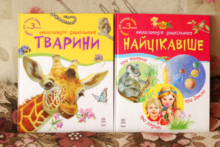 Энциклопедии для малышей от изд-ва "Ранок". Вот он минус покупки в офлайне - совершенно некогда долго стоять в книжном отделе, листать и анализировать :( Не обратила внимание, что половина энциклопедии о животных входит в "Найцікавіше". Ну да ладно, не вся же :) Написано что от 3х лет - наверное, где-то так и есть) В 2 рановато, сведения на уровне где-то 3-4х. Серия энциклопедий очень неоднозначная, в этих еще рисунки более-менее, а есть вообще трэш и ужас, или полная бессмысленность (типа эниклопедия для девочек - о бусиках, куклах и т.д. в вырвиглазно-розовых тонах и т.п.) Этими в принипе довольна.