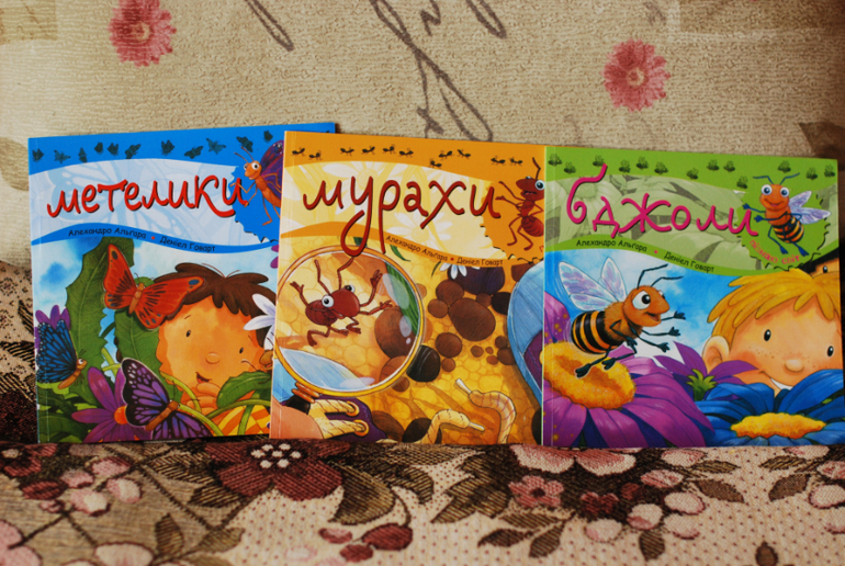 Тонкие книжечки в мягкой обложке о жизни насекомых. Иллюстрации очень хороши :) В серии была еще книжка про пауков, но заказывать не стала, может, позже. Текст и пояснения - где-то для 3-4-летки, я думаю. Минус - на мой взгляд завышенная цена.
