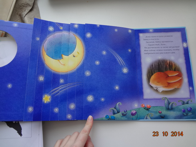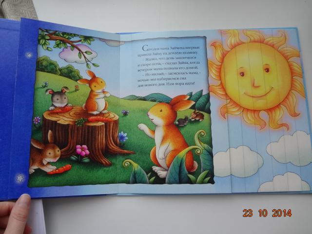 Сделана так же как и . День сменяет ночь, солнышко исчезает и появляется месяц. Коротенькая история о том, как зайчик не хотел идти спать, а мама с папой его уговаривали.