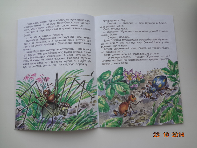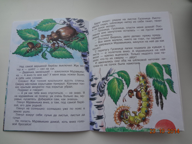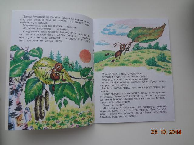 Маленькая книжка в тонкой обложке. История о том, как муравья отнесло ветром далеко от дома и он просил разных насекомых донести до дома.