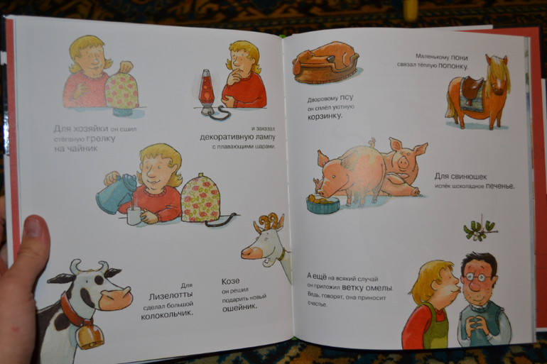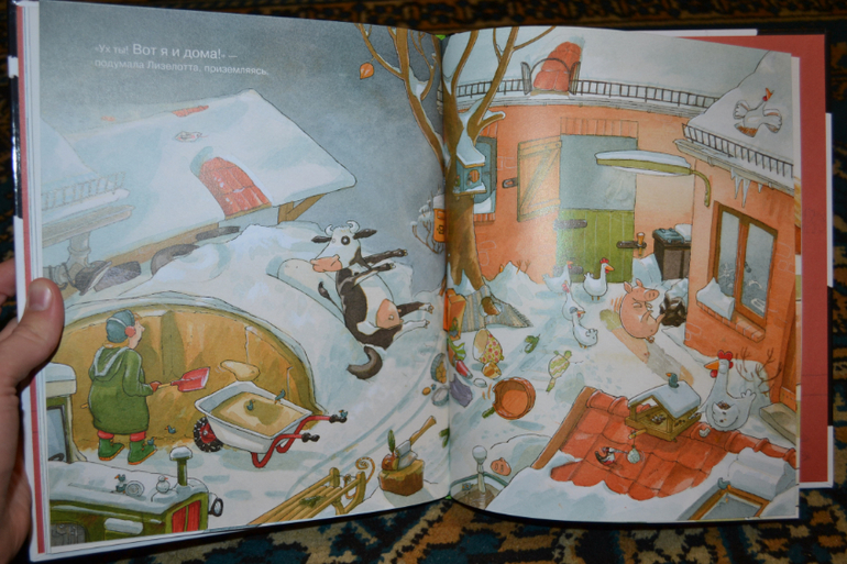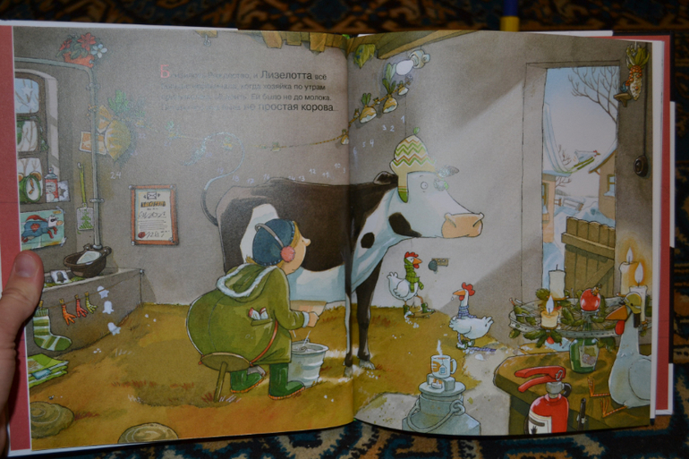 Взяла на май шопе на пробу одну книгу из серии.Цена у неё не кусачая, и я решила, что про корову сыну должно понравиться))) Тем более, что в отзывах пишут, что иллюстрации очень интересно разглядывать.Мы такое любим))) Оформлена книга достойно.Очень люблю, когда форзацы не просто форзацы, а уже часть книги))) Иллюстрации разные: то на весь разворот, то в виде комиксов.Что-то общее с иллюстрациями в книгах про Петсона и Финдуса: на одной картинке один и тот же герой изображён несколько раз.Вообще конечно книга рассчитана на то, что будешь сидеть и разглядывать, всматриваться, т. к. не сразу понятно всё то, что нарисовано.Сама история незамысловатая, простенькая.Первый раз сыну читал муж, и он (муж) книгой не проникся.Я прочитала сама одна, пока не определилась до конца с эмоциями...Будем ещё пробовать)))
