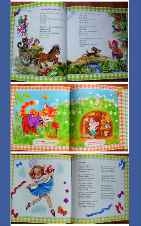 Итак, это - сборник. Тут и русские народные сказки, и по мотивам мультфильмов, и несколько песенок с нотами... Потрясающие иллюстрации, возвращающими в детство и которые сложно найти в современных книгах.