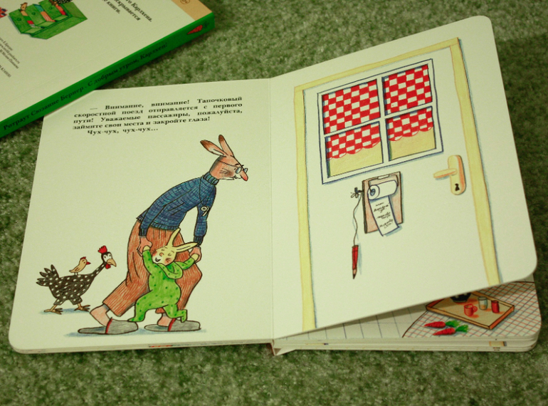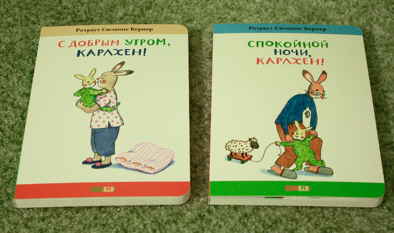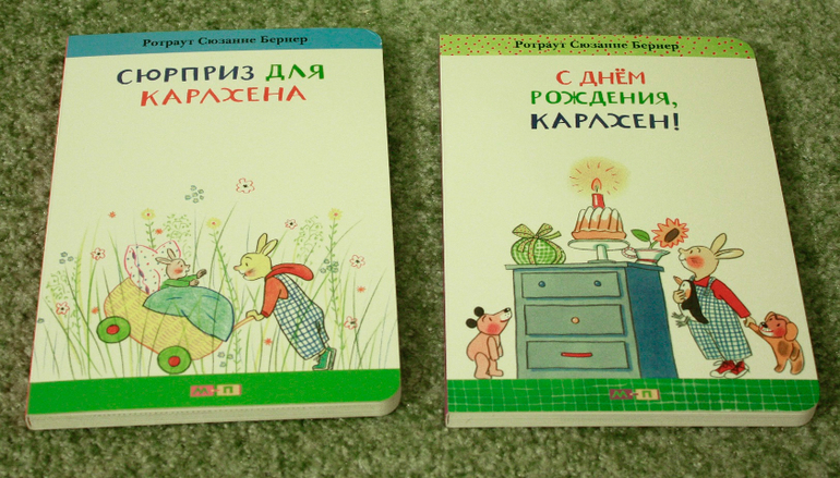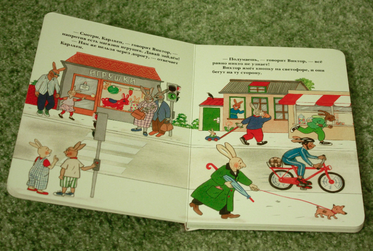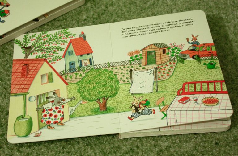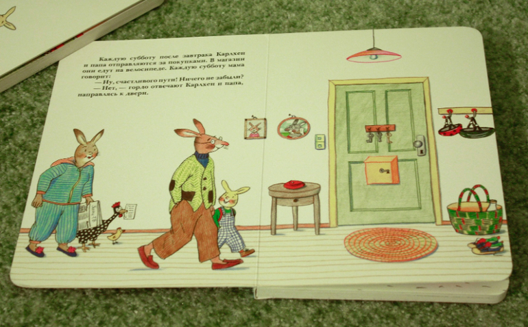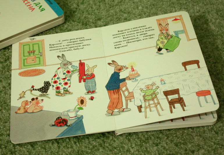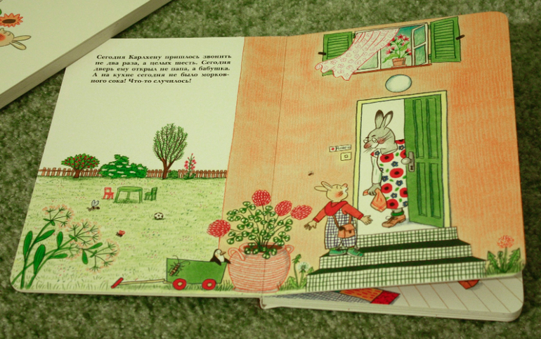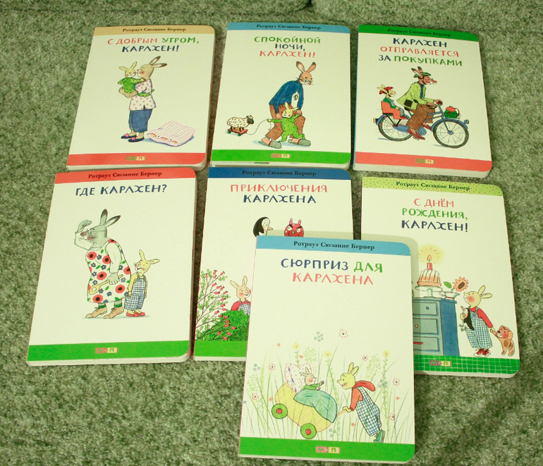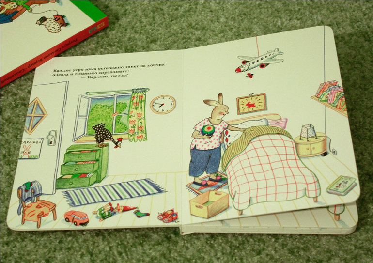 Сначала я совсем-совсем не хотела покупать, эти кролики мне казались просто некрасивыми. Много раз читала хвалебные обзоры, но покупать не хотела (от слова совсем). Однако, была акция лабиринта, где в подарок шли 2 из 7 книжек (картонных, есть еще и на офсете для возраста постарше). После первого прочтения я с ужасом поняла, что эти кролики ТАК ПОНРАВИЛИСЬ ВАСИЛИСЕ, что все остальные книги резко отошли на второй план. Просто невозможная любовь к книгам. В итоге докупила всю серию и... теперь самой нравится) Кроме одной книги "Приключения Карлхена" - там Карлхен не слушает маму, убегает и от этого всем хорошо и весело. Непорядок. Пока еще читаю, но постарше станет - обязательно уберу.