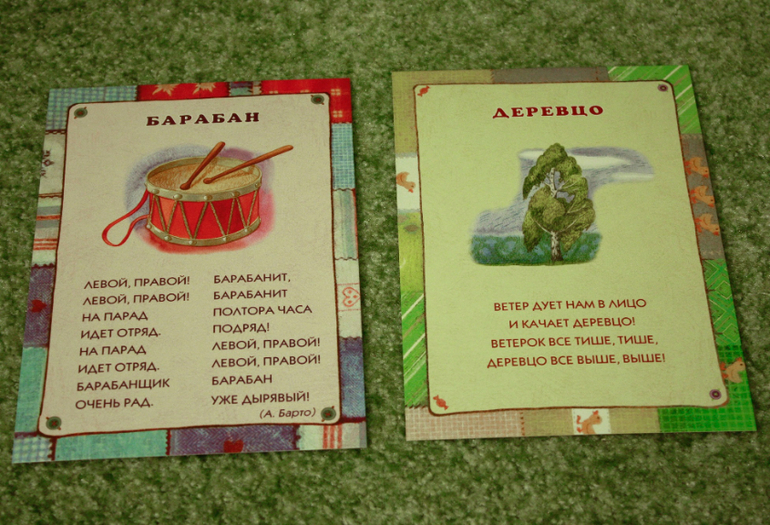 Спереди стихи, на обороте пояснения движений. Нам пока рано все, кроме 2-3 карточек(