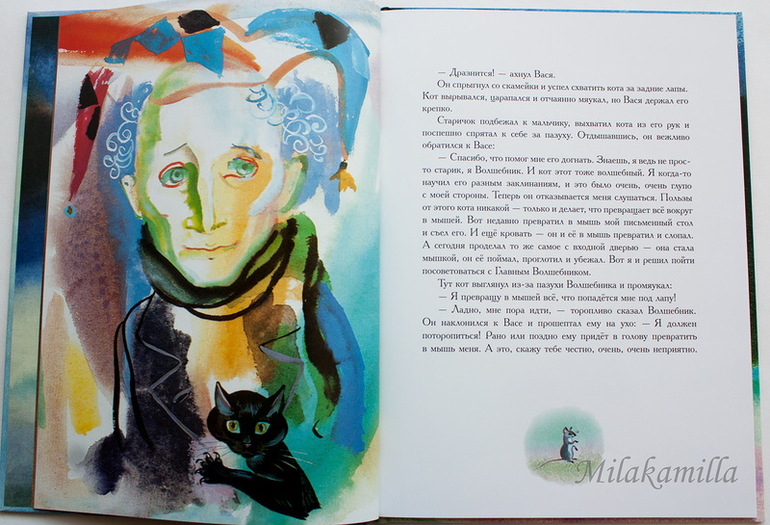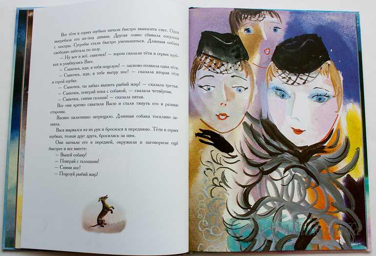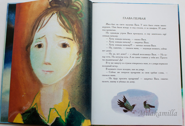 Мы давно уже читали несколько раз сказку, но видимо, чем-то очень нравится она Эмилии, что книга открывается вновь и вновь, а вот в илл. М. Бычкова, читала она в первый раз. Картинами была заворожена, видно было, как долго их рассматривает, проводит пальчиками по масляным штрихам.