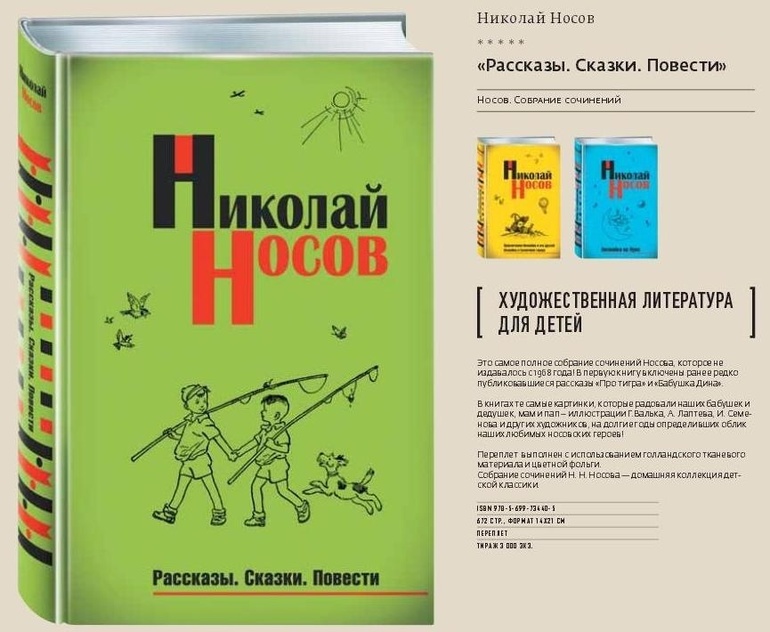 Рассказы Носова с иллюстрациями Валька и черно-белого Семенова давно не издавали, я уж отчаялась. Но жалко, что сборником, мне бы аналог книжки "Фантазеры" 1976 г.Содержание собрания сочинений 1968 г., с которого сделано переиздание:Т. 1. Рассказы. Сказки. Повести. 663 стр.Содерж.: В. Катаев. О Николае Носове. Рассказы и сказки. Мишкина каша. Телефон. Бенгальские огни. Тук-тук-тук. Огородники. Рис. Г. Валька. Приключения Толи Клюквина. Про Гену. Клякса. Федина задача. Находчивость. Наш каток. Замазка. Рис. И. Семенова. Фантазеры. Живая шляпа. На горке. Саша. Ступеньки. Метро. Огурцы. Прятки. Карасик. Автомобиль. Затейники. Заплатка. Леденец. Шурик у дедушки. Про репку. Милиционер. И я помогаю. Три охотника. Когда мы смеемся. Бобик в гостях у Барбоса. Под одной крышей. Рис. Г. Валька.Повести. Веселая семейка. Рис. И. Семенова. Дневник Коли Синицына. Рис. В. Ладягина. Витя Малеев в школе и дома. Рис. Г. Позина.Т 2. Рис. А. Лаптева. 1969. 496 стр.Содерж.: Приключения Незнайки и его друзей. Роман-сказка. Незнайка в Солнечном городе. (Роман-сказка в 2-х ч.).Т. 3. 1969. 544 стр.Содерж.: Незнайка на Луне. Роман-сказка в 4-х ч. Рис. Г. Валька.