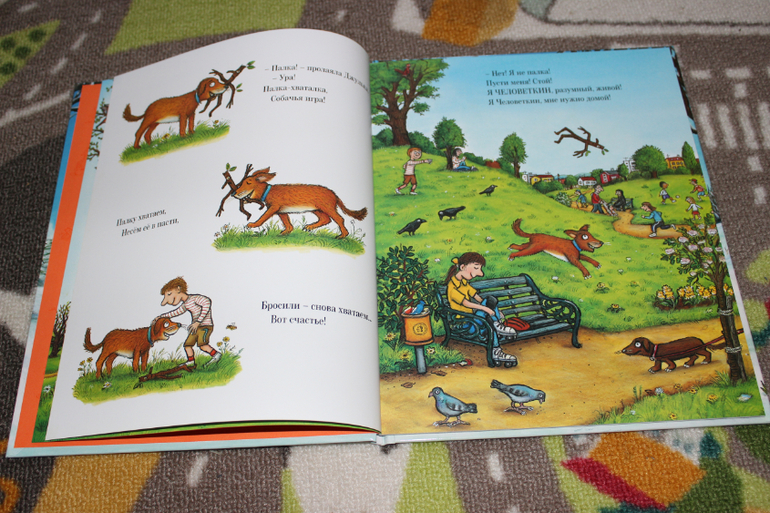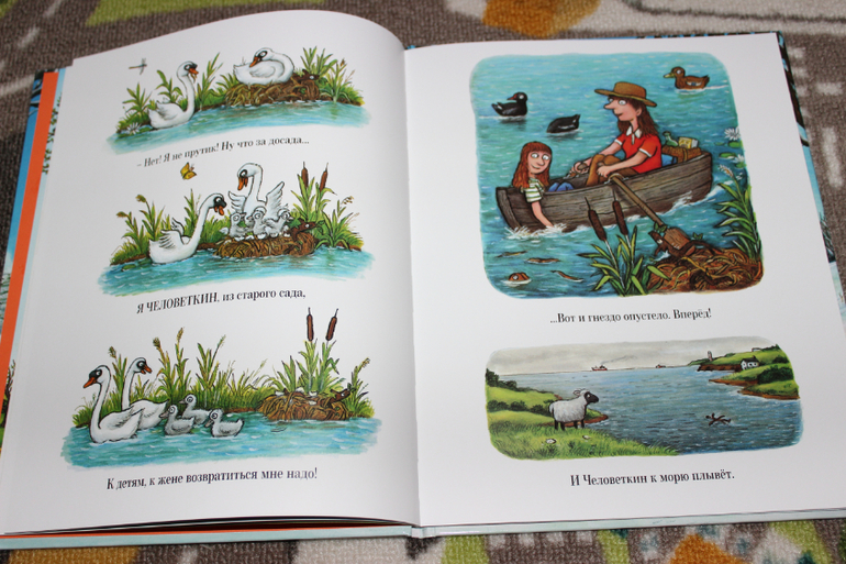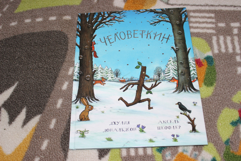Как всегда прекрасные стихи, замечательные иллюстрации и интересные истории. Книги Дональдсон мы очень любим. Они легко читаются с нужной интонацией, сыну это нравится. Это история о Человеткине, который отправился на пробежку, но попал в неприятности. Собака приняла его за палку, с которой можно поиграть, лебедь решил, что это прутик для гнезда. Но, как всегда в книгах этого автора нас ждет счастливый конец.