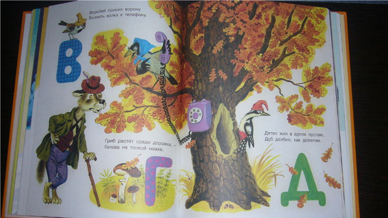 Да, а еще именно по этой книге Даня стал пытаться сам что- нибудь "прочесть"- уж больно ему понравились крупные, разноцветные буквы в начале каждой страницы.