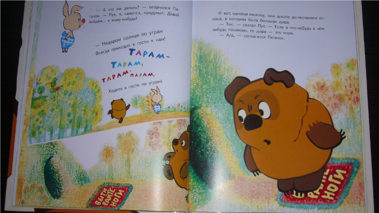 Теперь мы частенько шепчем друг другу на ухо слово " Мед", как шептал Пух Пятачку, мы каждый день напеваем песенки, которые сочинил Винни. Даня частенько стукает обо что- нибудь ногой со словами: " Сова, открывай- медведь пришел!".