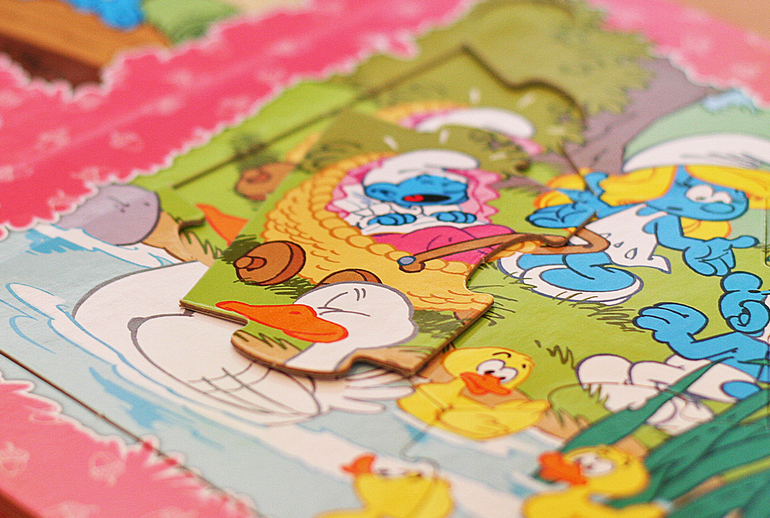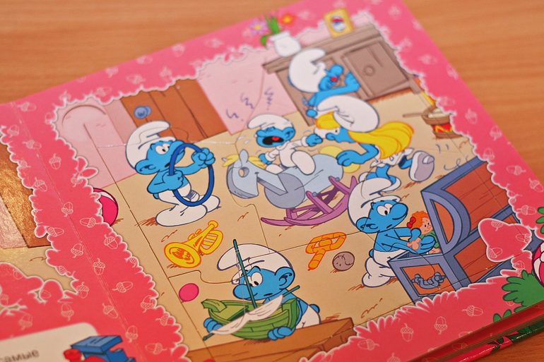Крошка-смурфик купила в Фикс-прайсе за 39 руб. Приятная цена для такой книги с пазлами. Плотный картон, яркие иллюстрации. Пока не заинтересовала, но я далеко не убираю.