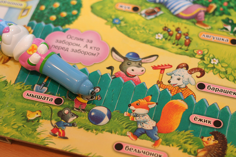 Подарила бабушка. Книжка на вырост. Нужно найти правильный ответ и ткнуть ручкой-зайкой на точку под ним. Если верно ответил - раздается приятный звук (первые 5 минут игры