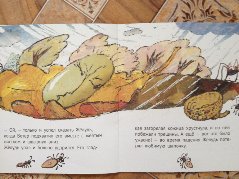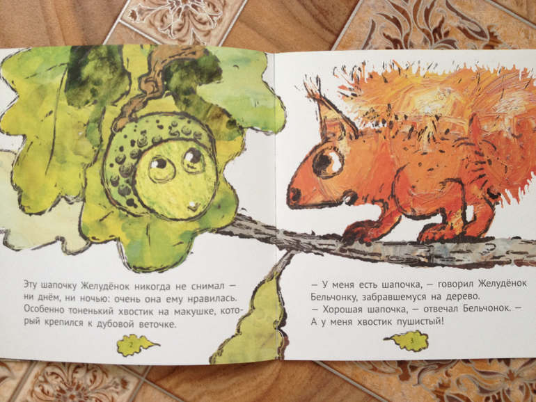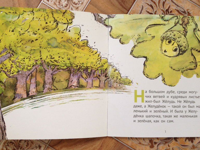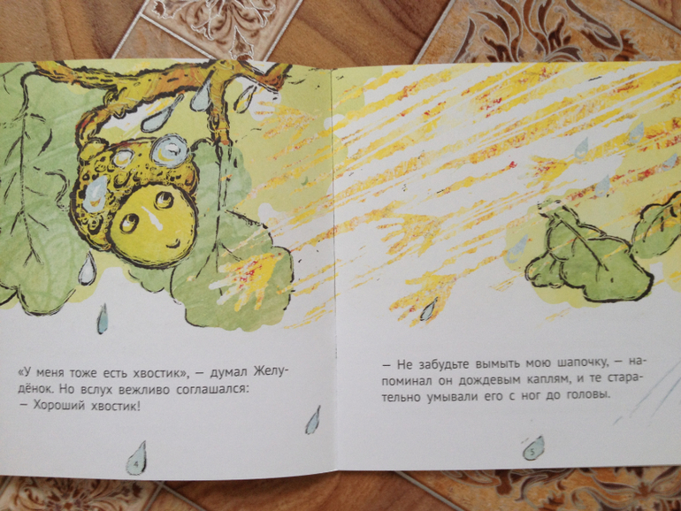В книжке "Желуденок" мне очень понравились необычные иллюстрации. А Ваня чуть не прослезился, когда желудь упал с дуба.