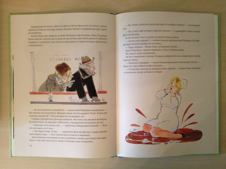 Еще одна книга, которая нам с Ваней очень понравилась - это "Зеленая пилюля". Просто потрясающие иллюстрации! Иллюстраций в книге очень много и они полностью соответствуют тексту. Было очень интересно наблюдать на картинках, как Вова становится все моложе и моложе) Мне очень хотелось, чтобы Ваня сам догадался, какое действие оказывают эти пилюли на Вову, задавала ему наводящие вопросы и он все-таки догадался.![]()