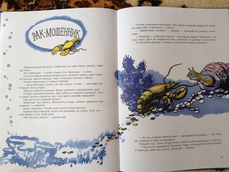 Каждая сказка - это своего рода миниэнциклопедия. Столько всего узнаешь о морских обитателях после прочтения. Больше всего нам понравилась сказка про кита, которого спас краб, Ваню особенно впечатлила тема приливов и отливов. После читали книгу«Улитка и кит» и Ваня сразу вспомнил, что летом у бабушки тоже про кита читали, который из-за отлива оказался на берегу.