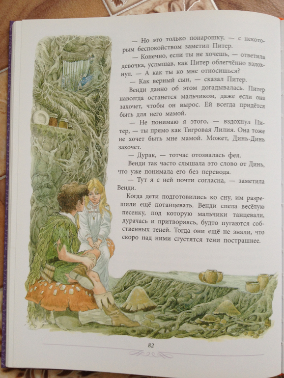 В детстве я эту книгу не читала, да и если честно, после прочтения лично мне она совсем не понравилась. Возможно из-за перевода (в данном случае, пересказа Ирины Токмаковой), нашла в сообществе отзывы о том, что лучший перевод - это перевод Демуровой. Стало очень интересно прочитать и сравнить свои впечатления. Очень многое в книге я просто пропускала или заменяла слова. Например, момент, как Крюк потерял руку я прочитала, но меня покоробило, что я читаю это Ване, хотя он сидел и слушал с открытым ртом. Последняя битва Питера и Крюка, эпизод, где Малыш считает убитых, фразы типа: «Рубите его на куски, парни!», сцена в конце книги, где Крюка съедает крокодил, меня вообще шокировали немного. Фея Динь-Динь и то, как она решила отомстить Венди, мягко скажем, очень изощренно. Книга однозначно для школьного возраста и для самостоятельного чтения.![]()