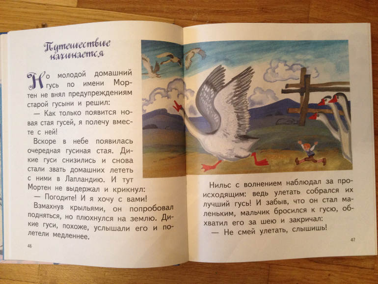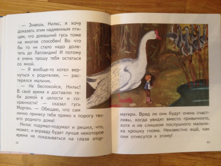 «Чудесное путешествие Нильса с дикими гусями» Книга мне очень понравилась, несмотря на то, что текст не полный. Понравились рисунки, они на каждой странице, правда, создается впечатление, что рисунки как-то ограничены в пространстве, но по мере чтения меня это не напрягало. Шрифт просто замечательный для самостоятельного чтения. Думаю, эту книгу обязательно нужно прочитать. Сказка очень поучительная: из хвастливого мальчишки Нильс превращается в смелого и доброго человека, всегда готового прийти на помощь. Сами приключения маленького Нильса очень захватывают, мы прочитали книгу очень быстро, хотя в начале чтения Ваня как-то не очень проникся, но потом сам просил продолжения.![]()