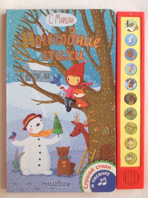 Новинка от АСТ, "Новогодние стихи" Маршака - первая книга с кнопками в нашей библиотеке. Никогда их не покупала и не собиралась, но в праздник очень хочется удивлять, а удивить книгой уже очень трудно) Издание на плотном ламинированном картоне, буквы на обложке золотые, всего 5 разворотов, 10 кнопок и 3(три!) стихотворения. Обилие кнопок меня лично ввело в заблуждение, ожидала содержание побогаче. Стихотворение "Январь" озвучено песенкой, в остальных четверостишия попеременно читают мужчина и женщина, одно четверостишие не озвучено.