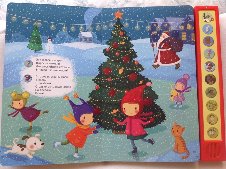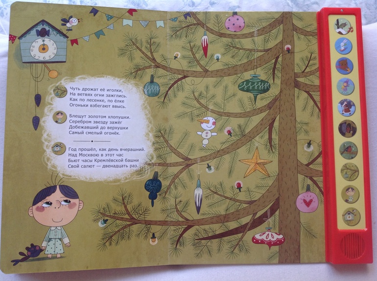 Елка плакала сначалаОт домашнего тепла.Утром плакать перестала, Задышала, ожила.У каждого озвученного четверостишия нарисована подсказка, какую кнопку нажиматьИ еще там ошибка, вместо "столько вспыхнуло огней", как в тексте, голос читает "столько выросло огней"Ну и советская детвора заменена на российскую, конечно же)