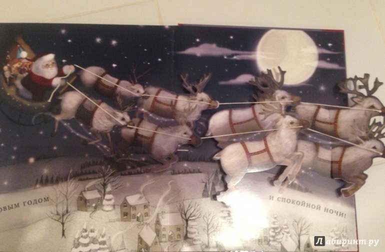 Объемные картинки, картинки оживают, а на последней странички, олени в упряжке прошиты нитками улетают из книги.