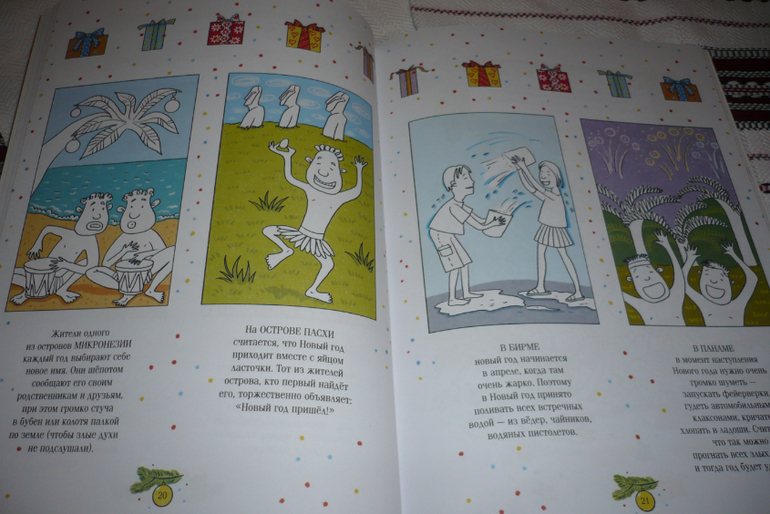 Два разворота посвящены новогодним традициям. Рассказано о праздновании Нового года итальянцами, англичанами, шотландцами, японцами, кубинцами, жителями Микронезии, острова Пасхи, Бирмы и Панамы.