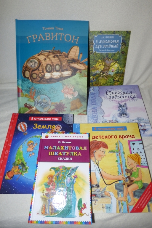 А Малахитовая шкатулка у вас обычного формата? Что-то вытянутая на фото получилась... А Лукоморье я купила маленькому, 1,9, а с удовольствием прочитал старший, 7-летний первоклассник-книга эта понравилась всем нам, смотрим картинки и читаем с удовольствием. (не то что Стройку баюшки-баю! Ребенку маленькому нравится, а нам с мужем не нравится этот стишок, какой-то он корявый). Гравитон едет к нам в посылке. У Детского врача тоже в отложенных.
