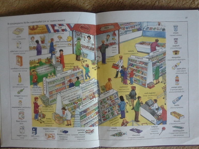 А здесь видите девушку в лепардовых лосинах с тележкой? Ульяна думает, что это я))) Мы пальчиками ходим по магазину и собираем этой девушке всё в тележку...Эта самая популярная игра у нас по этой книжке