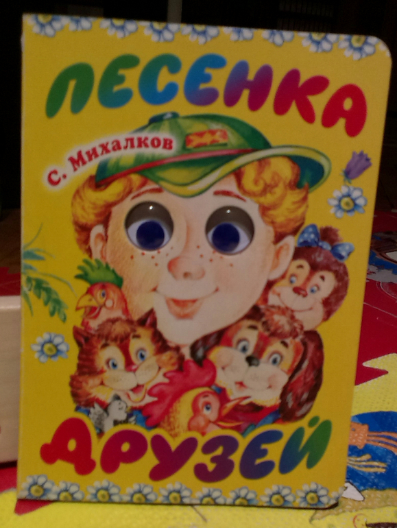 Первая и единственная глазастая книга "Песенка друзей" С.Михалков изд. "Астрель" (АСТ). Текст знаком всем, без изменений, на каждой страничке прорези для глаз, в которые так и норовят нырнуть детские пальчики. Ребенка в данной книге привлекают не иллюстрации, не текст, а именно прорези для глаз. Этим и объясняется то, что это единственная глазастая книга на нашей полке.