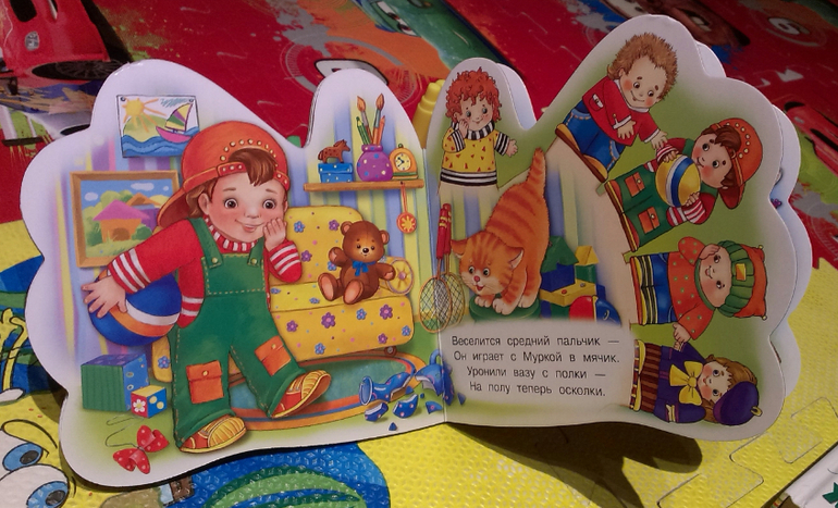 На каждом из разворотов изображена ладошка и посвящен стишок каждому из пальчиков. Я считаю, что данная книжка будет полезна детям, которые уже знают названия всех пальчиков, нам конечно сейчас (1,1 год) смысл стихов понять достаточно трудно, но рассматриваем картинки и перелистываем страницы с удовольствием. На книге указан рекомендуемый возраст 2-4 года.