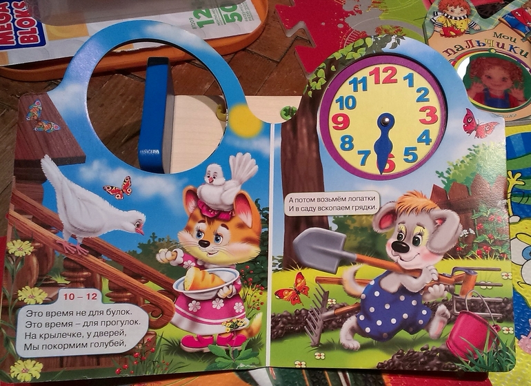 Единственный минус-это стрелки из пленки, гораздо удобнее были бы пластиковые. От чтения данной книги ребенок восторга не испытывает, притягивают только стрелки и вырубка.