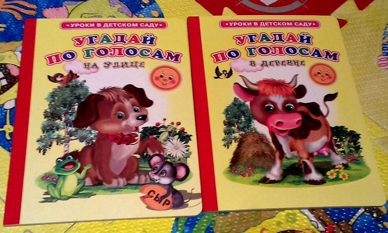 Все то же издание, та же серия и автор, "Угадай по голосам на улице" и "Угадай по голосам в деревне". На каждой из страничек добрый стишок про зверя\птицу с обязательной подсказкой - голосом, ну и конечно иллюстрация тоже в помощь ребенку. После стишка напечатан ответ. Иллюстрации очень добрые, красочные, звери\птицы улыбаются. На мой взгляд очень хорошие книги- можно выучить животных и их голоса. Т.к. эти две книги у нас совсем новые, мы конечно пока ничему научиться из них не успели, но дочка с интересом слушает и разглядывает картинки, а особенно ей нравится когда мама мычит, квакает и т.п..